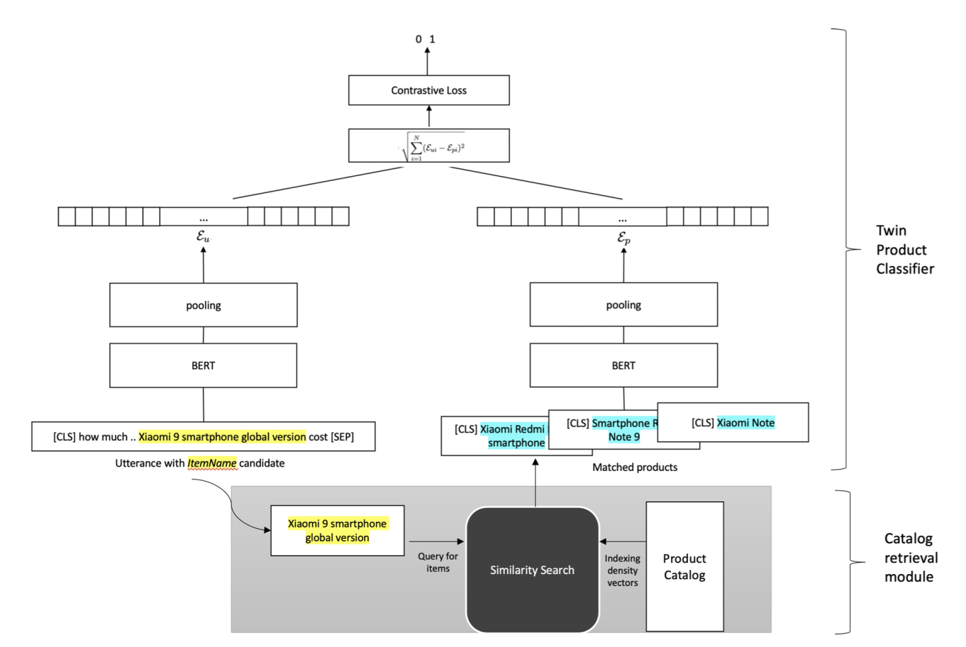 To improve the shopping experience with voice assistants, we developed an approach to detect items purchasable on the connected e-commerce platform based on exploitation of the product catalog.
