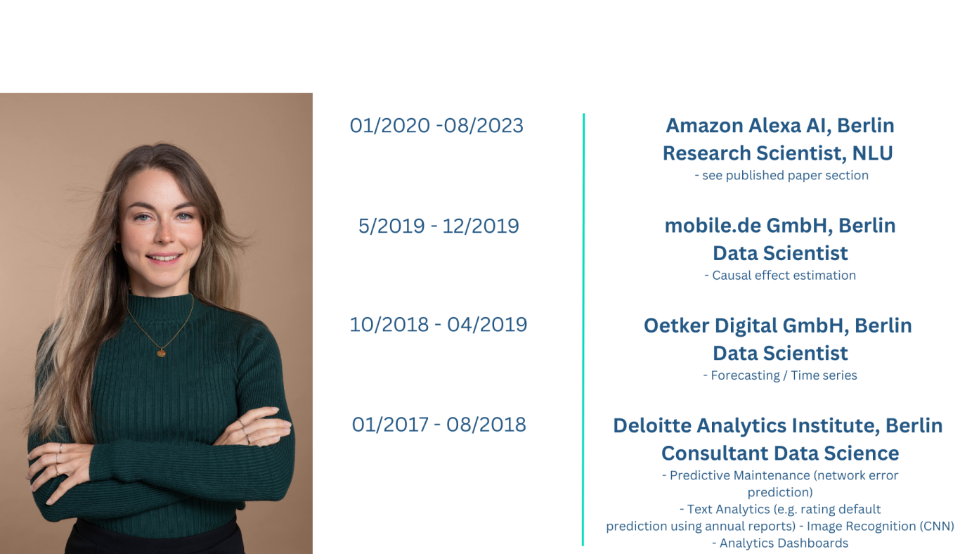 Consulting is known territory for me - after finishing my studies in statistics, I joined Deloitte as a consultant for Data Science. The last 3.5 years I worked as Research Scientist for Alexa, Amazon deepening my knowledge in NLP, Deep Learning and Generative AI. Download my CV and learn more about my journey so far.